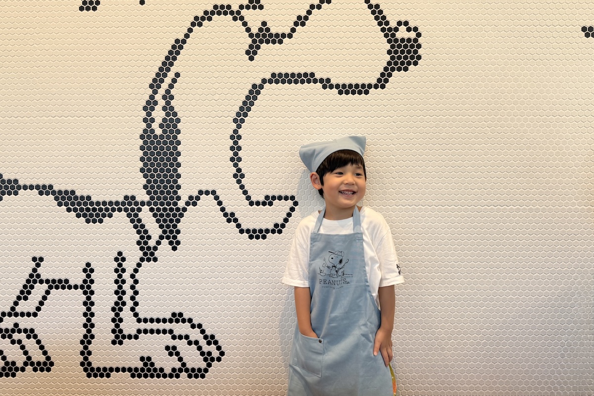 参加者だけがもらえるスヌーピーのアートをあしらったオリジナルエプロンを身につけて、スヌーピーのパンケーキにフルーツやソースでデコレーションをし、自分だけのオリジナルパンケーキづくりを体験していただけます。